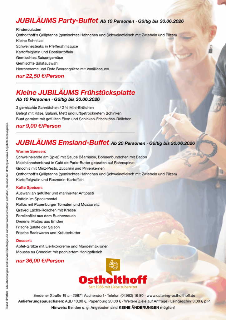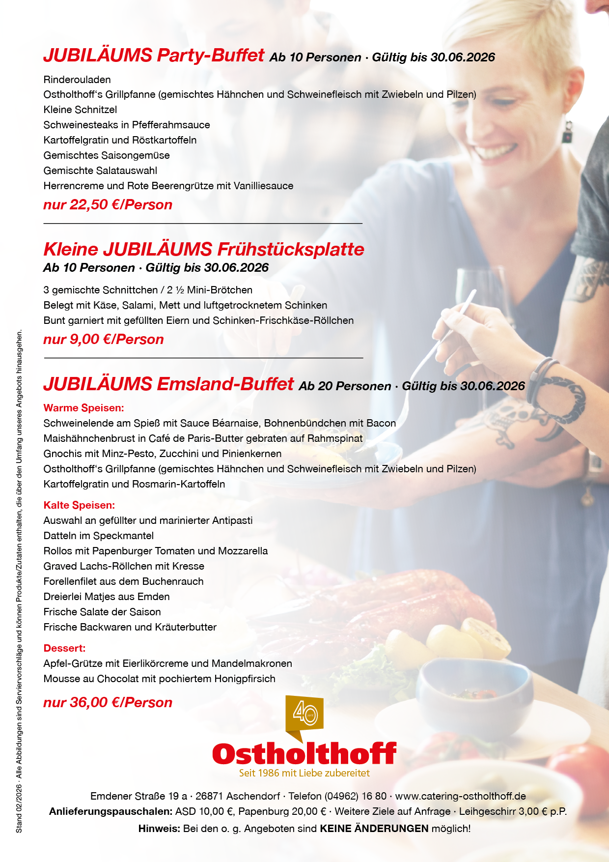 Seit 40 Jahren steht der Name Ostholthoff für Qualität, Genuss und echte Handwerkskunst. Dieses Jubiläum möchten wir mit Ihnen feiern – mit besonderen Angeboten, die unsere langjährige Erfahrung und unsere Leidenschaft für gutes Essen widerspiegeln.